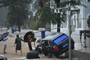 (251006) -- BEIHAI, 6 octubre, 2025 (Xinhua) -- Un vehículo volcado es levantado, en Beihai, en la región autónoma de la etnia zhuang de Guangxi, en el sur de China, el 6 de octubre de 2025. El tifón Matmo, la 21ª tormenta con nombre de la temporada de tifones del Pacífico de 2025, tocó tierra a lo largo de la costa de Guangxi el lunes, trayendo fuertes vientos y densas lluvias. (Xinhua/Li Junguang) (rtg) (ah) (vf)