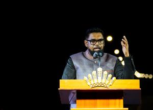(251006) — GEORGETOWN, 6 octubre, 2025 (Xinhua) — Imagen del 5 de octubre de 2025 del presidente de Guyana, Irfaan Ali, hablando en la ceremonia de inauguración del nuevo puente sobre el río Demerara, en Georgetown, capital de Guyana. El nuevo puente sobre el río Demerara, oficialmente denominado Puente Bharrat Jagdeo y construido por China Railway Construction Corporation International, fue inaugurado la noche del domingo en una ceremonia en la que el presidente de Guyana, Irfaan Ali, destacó que esta infraestructura marca el inicio de una nueva era de transformación para el país sudamericano. (Xinhua/Xu Yongzheng) (rtg) (ah) (vf)