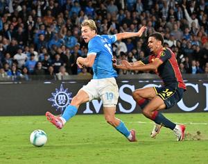 (251006) -- NAPOLES, 6 octubre, 2025 (Xinhua) -- Imagen del 5 de octubre de 2025 de Rasmus Hojlund (i), de Napoli, disputando el balón con Sebastian Otoa, de Genoa, durante el partido de la Serie A entre Napoli y Genoa, en Nápoles, Italia. (Xinhua) (rtg) (ah) (vf)