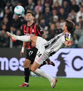 (251006) -- TURIN, 6 octubre, 2025 (Xinhua) -- Imagen del 5 de octubre de 2025 de Daniele Rugani (d), de Juventus, disputando el balón con Christian Pulisic, de AC Milan, durante el partido de fútbol de la Serie A, entre Juventus y AC Milan, en Turín, Italia. (Xinhua/Alberto Lingria) (rtg) (ah) (vf)