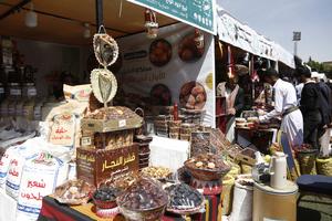 (251006) -- SANA, 6 octubre, 2025 (Xinhua) -- Personas compran dátiles durante el Festival de las Recompensas de Yemen, en Saná, Yemen, el 6 de octubre de 2025. (Xinhua/Mohammed Mohammed) (oa) (ah) (vf)