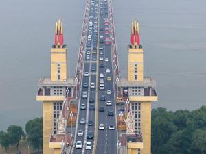 (251007) -- BEIJING, 7 octubre, 2025 (Xinhua) -- Imagen tomada con un dron el 7 de octubre de 2025 del flujo vehicular en el puente de Nanjing sobre el río Yangtse, en Nanjing, en la provincia de Jiangsu, en el este de China. A medida que las vacaciones del Día Nacional y el Festival de Medio Otoño llegan a su fin, los flujos de viajes de regreso aumentan en todo el país. (Xinhua/Yang Suping) (jg) (ra) (ce)