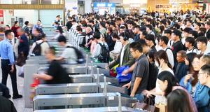 (251007) -- BEIJING, 7 octubre, 2025 (Xinhua) -- Personas ingresan a la Estación del Ferrocarril de Lianyungang, en Lianyungang, en la provincia de Jiangsu, en el este de China, el 7 de octubre de 2025. A medida que las vacaciones del Día Nacional y el Festival de Medio Otoño llegan a su fin, los flujos de viajes de regreso aumentan en todo el país. (Xinhua/Geng Yuhe) (jg) (ra) (ce)