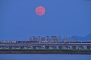 (251007) -- WENZHOU, 7 octubre, 2025 (Xinhua) -- La luna llena es vista sobre un tren en marcha, en la ciudad de Wenzhou, en la provincia de Zhejiang, en el este de China, el 7 de octubre de 2025. (Xinhua/Su Qiaojiang) (oa) (ah) (ce)