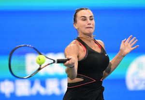 (251008) -- WUHAN, 8 octubre, 2025 (Xinhua) -- Aryna Sabalenka, de Bielorrusia, devuelve la pelota durante el partido de dieciseisavos de final de individuales femeninos ante Rebecca Sramkova, de Eslovaquia, en el torneo de tenis Wuhan Open 2025, en Wuhan, en la provincia de Hubei, en el centro de China, el 8 de octubre de 2025. (Xinhua/Cheng Min) (oa) (ah) (ra) (vf)
