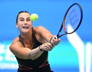 (251008) -- WUHAN, 8 octubre, 2025 (Xinhua) -- Aryna Sabalenka, de Bielorrusia, devuelve la pelota durante el partido de dieciseisavos de final de individuales femeninos ante Rebecca Sramkova, de Eslovaquia, en el torneo de tenis Wuhan Open 2025, en Wuhan, en la provincia de Hubei, en el centro de China, el 8 de octubre de 2025. (Xinhua/Cheng Min) (oa) (ah) (ra) (vf)