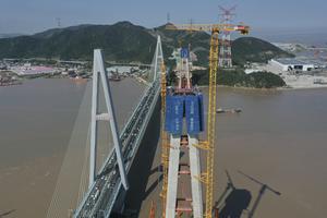 (251007) — ZHOUSHAN, 7 octubre, 2025 (Xinhua) — Vista aérea tomada con un dron el 6 de octubre de 2025 del sitio de construcción del puente carretero-ferroviario de Taoyaomen, en Zhoushan, en la provincia de Zhejiang, en el este de China. Una torre principal del puente carretero-ferroviario de Taoyaomen, construido por China Railway Major Bridge Engineering Group Co., Ltd., fue cerrada con éxito el lunes, lo que supone un avance significativo de este proyecto. (Xinhua/Huang Zongzhi) (jg) (ra) (ce)