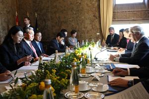 (251008) -- ROMA, 8 octubre, 2025 (Xinhua) -- El ministro de Relaciones Exteriores chino, Wang Yi, también miembro del Buró Político del Comité Central del Partido Comunista de China, se reúne con el vice primer ministro y ministro de Relaciones Exteriores y Cooperación Internacional de Italia, Antonio Tajani, en Roma, Italia, el 8 de octubre de 2025. (Xinhua/Li Jing) (jg) (da) (ce)