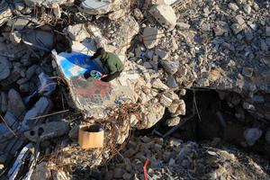 (251008) — GAZA, 8 octubre, 2025 (Xinhua) — Imagen del 5 de enero de 2024 de la artista palestina, Amal Abu Al-Sabah, pintando sobre los escombros, en la ciudad de Rafah, en el sur de la Franja de Gaza. Mientras Hamás e Israel se reúnen en Egipto para acordar un posible alto el fuego que el mundo espera con ansias, Gaza conmemoró el martes el sombrío segundo aniversario del conflicto. (Xinhua/Rizek Abdeljawad) (ah) (ra) (ce)