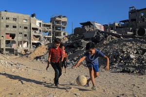 (251008) — GAZA, 8 octubre, 2025 (Xinhua) — Imagen del 20 de agosto de 2024 de niños palestinos jugando fútbol junto a los escombros de edificios, en la ciudad de Khan Younis, en el sur de la Franja de Gaza. Mientras Hamás e Israel se reúnen en Egipto para acordar un posible alto el fuego que el mundo espera con ansias, Gaza conmemoró el martes el sombrío segundo aniversario del conflicto. (Xinhua/Rizek Abdeljawad) (ah) (ra) (ce)