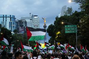 (251007) -- CIUDAD DE MEXICO, 7 octubre, 2025 (Xinhua) -- Personas participan en una marcha en apoyo a Palestina, en la Ciudad de México, capital de México, el 7 de octubre 2025. (Xinhua/Francisco Cañedo) (fc) (vf) (ce)