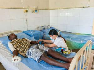 (251008) — ACRA, 8 octubre, 2025 (Xinhua) — Imagen del 3 de octubre de 2025 de una integrante del 26º grupo del equipo médico chino en Sierra Leona administrando una infusión intravenosa a un paciente tras someterse a una cirugía de reimplantación de dedo, en Freetown, Sierra Leona. El 26º grupo del equipo médico chino en Sierra Leona realizó la primera cirugía de reimplantación de dedo en la historia del país de Africa Occidental. (Xinhua/El 26º grupo del equipo médico chino en Sierra Leona) (jg) (da) (ce)