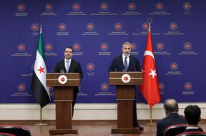 (251008) — ANKARA, 8 octubre, 2025 (Xinhua) — El ministro de Relaciones Exteriores turco, Hakan Fidan (d), y el jefe para Asuntos Exteriores sirio, Asaad Hassan al-Shibani, asisten a una conferencia de prensa conjunta, en Ankara, Turquía, el 8 de octubre de 2025. Asaad Hassan al-Shibani instó el miércoles a las Fuerzas Democráticas Sirias lideradas por los kurdos a implementar el acuerdo del 10 de marzo “sin demora”, un día después de que el líder del grupo y las autoridades sirias anunciaran un alto el fuego. (Xinhua/Mustafa Kaya) (ah) (ra) (ce)
