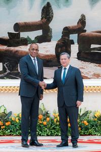 (251009) — PHNOM PENH, 9 octubre, 2025 (Xinhua) — El primer ministro camboyano, Hun Manet (d), estrecha la mano del visitante primer ministro dominiqués, Roosevelt Skerrit, en Phnom Penh, Camboya, el 9 de octubre de 2025. Camboya y la Mancomunidad de Dominica acordaron el jueves fortalecer y ampliar sus lazos bilaterales y su cooperación para beneficio mutuo. (Xinhua/Nitola) (jg) (ah) (ce)