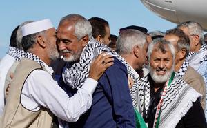 (251009) — TRIPOLI, 9 octubre, 2025 (Xinhua) — Imagen del 8 de octubre de 2025 de personas recibiendo a los tripulantes de la Flotilla Global Sumud liberados de la custodia israelí en el Aeropuerto Internacional de Mitiga, en Trípoli, Libia. El barco libio “Omar Al Mukhtar” partió de Trípoli el 21 de septiembre para unirse a la Flotilla Global Sumud con destino a Gaza. Durante el trayecto, el barco fue interceptado por Israel y la tripulación fue detenida. (Xinhua/Hazem Turkia) (da) (ra) (vf)