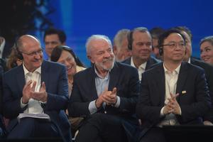 (251009) -- BAHIA, 9 octubre, 2025 (Xinhua) -- El presidente brasileño, Luiz Inácio Lula da Silva (c), el vicepresidente y ministro de Desarrollo, Industria, Comercio y Servicios brasileño, Geraldo Alckmin (i), y el presidente de BYD, Wang Chuanfu (d), reaccionan durante la inauguración de la nueva planta de vehículos eléctricos e híbridos de la china BYD Brasil, en Camacari, en el estado de Bahía, Brasil, el 9 de octubre de 2025. La ceremonia marcó el inicio de la producción brasileña y consolida al país sudamericano como un polo estratégico de la compañía para América Latina. (Xinhua/Lucio Tavora) (lt) (da) (ra) (vf)