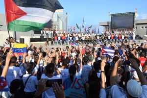 (251009) -- LA HABANA, 9 octubre, 2025 (Xinhua) -- Personas participan en un mitin en favor de la causa palestina en el malecón habanero, en La Habana, capital de Cuba, el 9 de octubre de 2025. Miles de cubanos se movilizaron el jueves en la ciudad de La Habana en favor de la causa palestina y contra el genocidio de Israel en la Franja de Gaza, en Medio Oriente. (Xinhua/Joaquín Hernández) (jh) (jg) (ah) (vf)