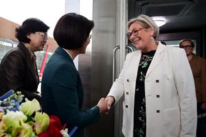 (251012) -- BEIJING, 12 octubre, 2025 (Xinhua) -- La presidenta islandesa, Halla Tomasdottir, llega a Beijing, capital de China, el 12 de octubre de 2025, para la próxima Conferencia de Líderes Mundiales sobre la Mujer. (Xinhua/Zou Jingyi) (rtg) (da)
