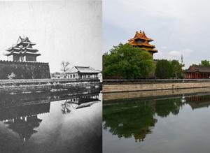 (251010) -- BEIJING, 10 octubre, 2025 (Xinhua) -- Imagen combinada de una torreta del Museo del Palacio a principios del Siglo XX (i, proveída por el Museo del Palacio) y del 10 de octubre de 2025 (d, imagen del fotógrafo de Xinhua, Jin Liangkuai), en Beijing, capital de China. Este año se conmemora el centenario de la fundación del Museo del Palacio. (Xinhua) (rtg) (ra) (vf)
