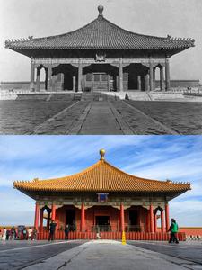(251010) -- BEIJING, 10 octubre, 2025 (Xinhua) -- Imagen combinada del Salón de la Armonía Central (Zonghe dian) del Museo del Palacio a principios del Siglo XX (arriba, proveída por el Museo del Palacio) y del 10 de octubre de 2025 (abajo, imagen del fotógrafo de Xinhua, Jin Liangkuai), en Beijing, capital de China. Este año se conmemora el centenario de la fundación del Museo del Palacio. (Xinhua) (rtg) (ra) (vf)