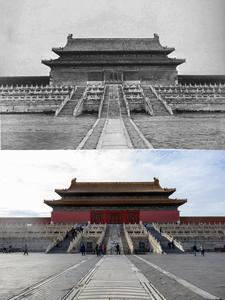 (251010) -- BEIJING, 10 octubre, 2025 (Xinhua) -- Imagen combinada del Salón de la Armonía Conservada (Baohe dian) del Museo del Palacio a principios del Siglo XX (arriba, proveída por el Museo del Palacio) y del 10 de octubre de 2025 (abajo, imagen del fotógrafo de Xinhua, Jin Liangkuai), en Beijing, capital de China. Este año se conmemora el centenario de la fundación del Museo del Palacio. (Xinhua) (rtg) (ra) (vf)
