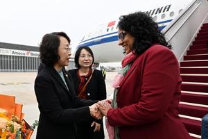 (251012) -- BEIJING, 12 octubre, 2025 (Xinhua) -- La primera ministra de Sri Lanka, Harini Amarasuriya, llega a Beijing, capital de China, el 12 de octubre de 2025, para la próxima Conferencia de Líderes Mundiales sobre la Mujer. (Xinhua/Zou Jingyi) (rtg) (da)