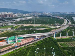 (251010) — JIANGMEN, 10 octubre, 2025 (Xinhua) — Vista aérea tomada con un dron de un tren de carga circulando bajo un puente giratorio a lo largo del Ferrocarril de Alta Velocidad Shenzhen-Jiangmen, en la provincia de Guangdong, en el sur de China, el 10 de octubre de 2025. El puente de 11.216 toneladas que se extiende 160 metros sobre una línea ferroviaria de mercancías fue rotada con éxito a la posición prevista el viernes por la mañana. (Xinhua/Liu Dawei) (oa) (ra) (vf)
