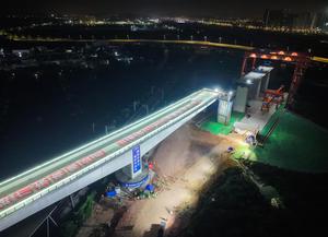 (251010) — JIANGMEN, 10 octubre, 2025 (Xinhua) — Vista aérea tomada con un dron de un puente giratorio que será rotado hasta su posición designada a lo largo del Ferrocarril de Alta Velocidad Shenzhen-Jiangmen, en la provincia de Guangdong, en el sur de China, el 10 de octubre de 2025. El puente de 11.216 toneladas que se extiende 160 metros sobre una línea ferroviaria de mercancías fue rotada con éxito a la posición prevista el viernes por la mañana. (Xinhua/Liu Dawei) (oa) (ra) (vf)