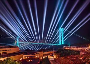 (251012) — ZHENFENG, 12 octubre, 2025 (Xinhua) — Imagen del 11de octubre de 2025 de un espectáculo de luces celebrado en el puente del Gran Cañón de Huajiang, en la provincia de Guizhou, en el suroeste de China. El puente del Gran Cañón de Huajiang, que se eleva 625 metros sobre el río Beipan en el terreno montañoso de Guizhou, es el puente más alto del mundo. Con un vano principal de 1.420 metros, el proyecto se ha convertido en el puente colgante con vigas de acero de mayor vano del mundo en terreno montañoso, según las autoridades provinciales de Guizhou. (Xinhua/Yang Wenbin) (oa) (rtg) (da)