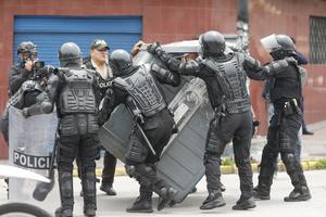 (251012) -- QUITO, 12 octubre, 2025 (Xinhua) -- Agentes de la policía remueven obstáculos para permitir la circulación vehicular durante una marcha en el marco del paro nacional, en el sector la Villaflora, en el sur de Quito, capital de Ecuador, el 12 de octubre de 2025. La ciudad ecuatoriana de Quito y sus principales accesos amanecieron el domingo con el blindaje de cientos de militares y policías, así como de tanquetas, ante las marchas convocadas por indígenas y sectores sociales, en apoyo al paro nacional encabezado por la Confederación de Nacionalidades Indígenas de Ecuador contra el alza del diésel. (Xinhua/Ricardo Landeta) (rl) (rtg) (da)