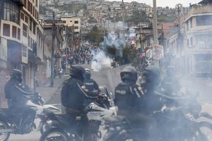 (251012) -- QUITO, 12 octubre, 2025 (Xinhua) -- Agentes de la policía disparan gases lacrimógenos a los manifestantes, durante una marcha en el marco del paro nacional, en el sector la Villaflora, en el sur de Quito, capital de Ecuador, el 12 de octubre de 2025. La ciudad ecuatoriana de Quito y sus principales accesos amanecieron el domingo con el blindaje de cientos de militares y policías, así como de tanquetas, ante las marchas convocadas por indígenas y sectores sociales, en apoyo al paro nacional encabezado por la Confederación de Nacionalidades Indígenas de Ecuador contra el alza del diésel. (Xinhua/Ricardo Landeta) (rl) (rtg) (da)