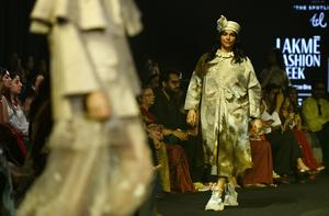 (251012) -- NUEVA DELHI, 12 octubre, 2025 (Xinhua) -- Una modelo presenta una creación del diseñador indio Ankur Verma durante la Semana de la Moda Lakme x FDCI, en Nueva Delhi, India, el 12 de octubre de 2025. (Xinhua/Javed Dar) (rtg) (da)