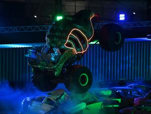 (251012) -- MUBARAK AL-KABEER, 12 octubre, 2025 (Xinhua) -- Imagen del 11 de octubre de 2025 de un camión monstruo de hot wheels realizando una presentación durante un espectáculo, en la gobernación de Mubarak Al-Kabeer, Kuwait. (Xinhua/Asad) (rtg) (ah)