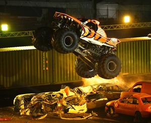 (251012) -- MUBARAK AL-KABEER, 12 octubre, 2025 (Xinhua) -- Imagen del 11 de octubre de 2025 de un camión monstruo de hot wheels realizando una presentación durante un espectáculo, en la gobernación de Mubarak Al-Kabeer, Kuwait. (Xinhua/Asad) (rtg) (ah)