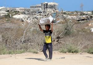 (251012) -- GAZA, 12 octubre, 2025 (Xinhua) -- Imagen del 11 de octubre de 2025 de un niño palestino cargando sus pertenencias mientras regresa a la Ciudad de Gaza. El acuerdo de alto el fuego entre Israel y Hamás entró en vigor el viernes. (Xinhua/Rizek Abdeljawad) (oa) (da)