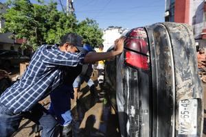 (251012) -- POZA RICA, 12 octubre, 2025 (Xinhua) -- Personas voltean un vehículo afectado por las lluvias, en la ciudad de Poza Rica, en el estado de Veracruz, México, el 12 de octubre de 2025. El estado mexicano de Veracruz, en la región oriental del país, enfrenta una severa emergencia derivada del desbordamiento del río Cazones que arrasó con viviendas, caminos y cosechas, en la región norte de la localidad del Golfo de México. (Xinhua/Francisco Cañedo) (fc) (oa) (da)