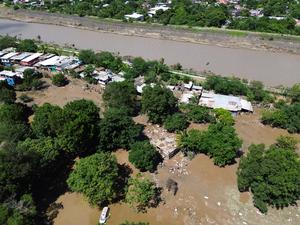 (251012) -- POZA RICA, 12 octubre, 2025 (Xinhua) -- Vista aérea tomada con un dron del 12 de octubre de 2025 de viviendas inundadas por las lluvias, en la ciudad de Poza Rica, en el estado de Veracruz, México. El estado mexicano de Veracruz, en la región oriental del país, enfrenta una severa emergencia derivada del desbordamiento del río Cazones que arrasó con viviendas, caminos y cosechas, en la región norte de la localidad del Golfo de México. (Xinhua/Francisco Cañedo) (fc) (oa) (da)