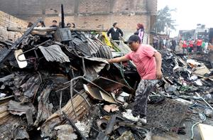 (251012) -- LIMA, 12 octubre, 2025 (Xinhua) -- Un hombre remueve escombros de casas destruidas por un incendio, en Pamplona Alta, en el distrito de San Juan de Miraflores, en Lima, Perú, el 12 de octubre de 2025. (Xinhua/Mariana Bazo) (mb) (rtg) (da)
