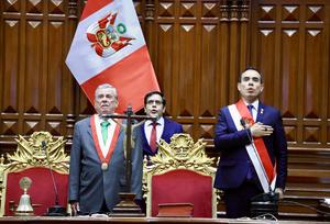 (251010) -- LIMA, 10 octubre, 2025 (Xinhua) -- Imagen proveída por el Congreso de la República de Perú del presidente peruano, José Jerí (d), y el primer vicepresidente del Congreso de Perú, Fernando Rospigliosi (i), entonando el himno nacional peruano tras la toma de juramento de Jerí como presidente de Perú, en el Congreso de la República de Perú, en Lima, Perú, el 10 de octubre de 2025. El presidente del Congreso de Perú, José Jerí, asumió el jueves la Presidencia de la nación sudamericana, luego de que el Congreso decidiera con 122 votos destituir del cargo a Dina Boluarte. (Xinhua/Congreso de la República de Perú) (vf) (ce)