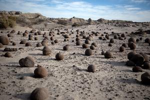 (251013) -- VALLE FERTIL, 13 octubre, 2025 (Xinhua) -- Imagen del 10 de octubre de 2025 de rocas esféricas afectadas por la erosión que forman parte del sector "Cancha de Bochas" en el Parque Provincial Ischigualasto o "Valle de la Luna", en la localidad de Valle Fértil, en la provincia de San Juan, Argentina. (Xinhua/Martín Zabala) (mz) (oa) (ah) (vf)