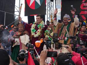 (251011) — EL ALTO, 11 octubre, 2025 (Xinhua) — El candidato a la Presidencia de Bolivia por el Partido Demócrata Cristiano, Rodrigo Paz Pereira (c), reacciona frente a sus simpatizantes durante uno de sus cierres de campaña, en la ciudad de El Alto, Bolivia, el 11 de octubre de 2025. El país sudamericano se prepara para una cita histórica el próximo 19 de octubre, cuando elegirá por primera vez en segunda vuelta al presidente y vicepresidente que gobernarán hasta 2030, tras una primera vuelta donde ya se definieron los diputados y senadores. (Xinhua/Javier Mamani) (jm) (jg) (da)
