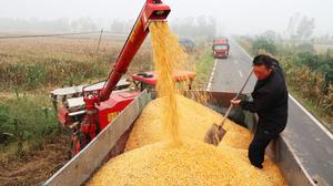 (251011) -- BEIJING, 11 octubre, 2025 (Xinhua) -- Un agricultor usa una pala para acomodar maíz, en el distrito de Haizhou, en la ciudad de Lianyungang, en la provincia de Jiangsu, en el este de China, el 11 de octubre de 2025. (Xinhua/Geng Yuhe) (oa) (da)