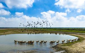 (251011) -- BEIJING, 11 octubre, 2025 (Xinhua) -- Vista aérea tomada con un dron el 11 de octubre de 2025 del paisaje de un humedal, en Dongtai, en la provincia de Jiangsu, en el este de China. (Xinhua/Sun Jialu) (oa) (da)