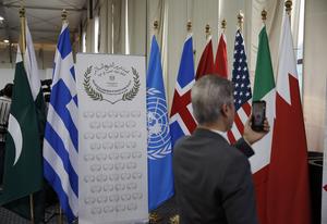 (251013) -- SHARM EL-SHEIKH, 13 octubre, 2025 (Xinhua) -- Imagen del 13 de octubre de 2025 de un cartel en el centro de medios de la sede de la cumbre para consolidar el alto el fuego entre Israel y Hamás, en Sharm el-Sheikh, Egipto. Una cumbre para poner fin a la guerra de Gaza comenzó el lunes en Sharm el-Sheikh y fue copresidida por el presidente egipcio, Abdel-Fattah al-Sisi, y su homólogo estadounidense, Donald Trump. (Xinhua/Wang Dongzhen) (rtg) (ah) (vf)