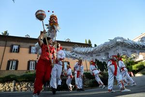 (251011) — ROMA, 11 octubre, 2025 (Xinhua) — Imagen del 10 de octubre de 2025 de entusiastas locales de la cultura china realizando la danza del dragón durante una feria de atracciones con temática del Festival de Medio Otoño en la Escuela Internacional Marymount, en Roma, Italia. La feria de atracciones se llevó a cabo aquí el viernes, donde estudiantes y residentes locales disfrutaron de una variedad de actividades y espectáculos culturales chinos presentados por entusiastas locales de la cultura china. (Xinhua/Li Jing) (jg) (da)