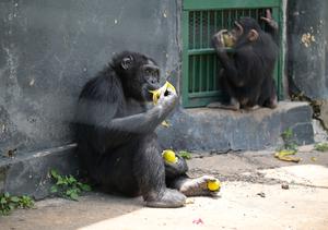 (251011) -- LAIKIPIA, 11 octubre, 2025 (Xinhua) -- Imagen del 7 de octubre de 2025 de un chimpancé comiendo plátano en el Santuario de Chimpancés Ol Pejeta, en el condado de Laikipia, Kenia. Establecido en 1993, el Santuario de Chimpancés Ol Pejeta de 250 acres ubicado en el condado de Laikipia, alberga actualmente a 29 chimpancés. (Xinhua/Yang Guang) (jg) (da)