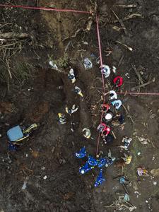 (251013) — PUEBLA, 13 octubre, 2025 (Xinhua) — Vista aérea tomada con un dron el 13 de octubre de 2025 de rescatistas realizando trabajos de búsqueda en una zona de un deslizamiento de tierra causado por las lluvias, en Huauchinango, en el estado de Puebla, México. A 64 aumentó el número de personas fallecidas en México por las lluvias e inundaciones registradas entre el 6 y el 9 de octubre pasado en los estados de Veracruz, Puebla, Hidalgo y San Luis Potosí, consideradas las más intensas del año en esa región del país, informaron el lunes las autoridades. (Xinhua/Francisco Cañedo) (fc) (oa) (ah) (vf)