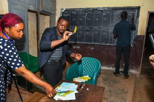 (251013) -- YAUNDE, 13 octubre de 2025 (Xinhua) -- Imagen del 12 de octubre de 2025 de funcionarios electorales contando y registrando votos en un colegio electoral, en Yaundé, capital de Camerún. La votación para las elecciones presidenciales de Camerún finalizó el domingo por la noche y ahora se está llevando a cabo el recuento de votos en todo el país. (Xinhua/Kepseu) (oa) (ah) (ce)