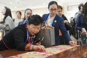 (251014) -- BEIJING, 14 octubre, 2025 (Xinhua) -- Representantes, que se encuentran en Beijing para asistir a la Conferencia de Líderes Mundiales sobre la Mujer, aprenden sobre el bordado de Beijing mientras visitan el edificio Calle de la Seda, en Beijing, capital de China, el 14 de octubre de 2025. (Xinhua/Xu Bingjie) (oa) (ah) (vf)