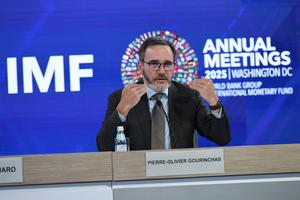 (251014) -- WASHINGTON, 14 octubre, 2025 (Xinhua) -- El economista en jefe del Fondo Monetario Internacional (FMI), Pierre-Olivier Gourinchas, habla en una conferencia de prensa sobre las Perspectivas de la Economía Mundial, en Washington, D.C., Estados Unidos, el 14 de octubre de 2025. El FMI elevó el martes su previsión del crecimiento económico mundial a 3,2 por ciento para 2025, lo que representa un incremento de 0,2 puntos porcentuales respecto a su proyección de julio, indica el informe Perspectivas de la Economía Mundial más reciente. (Xinhua/Li Rui) (jg) (ra) (vf)
